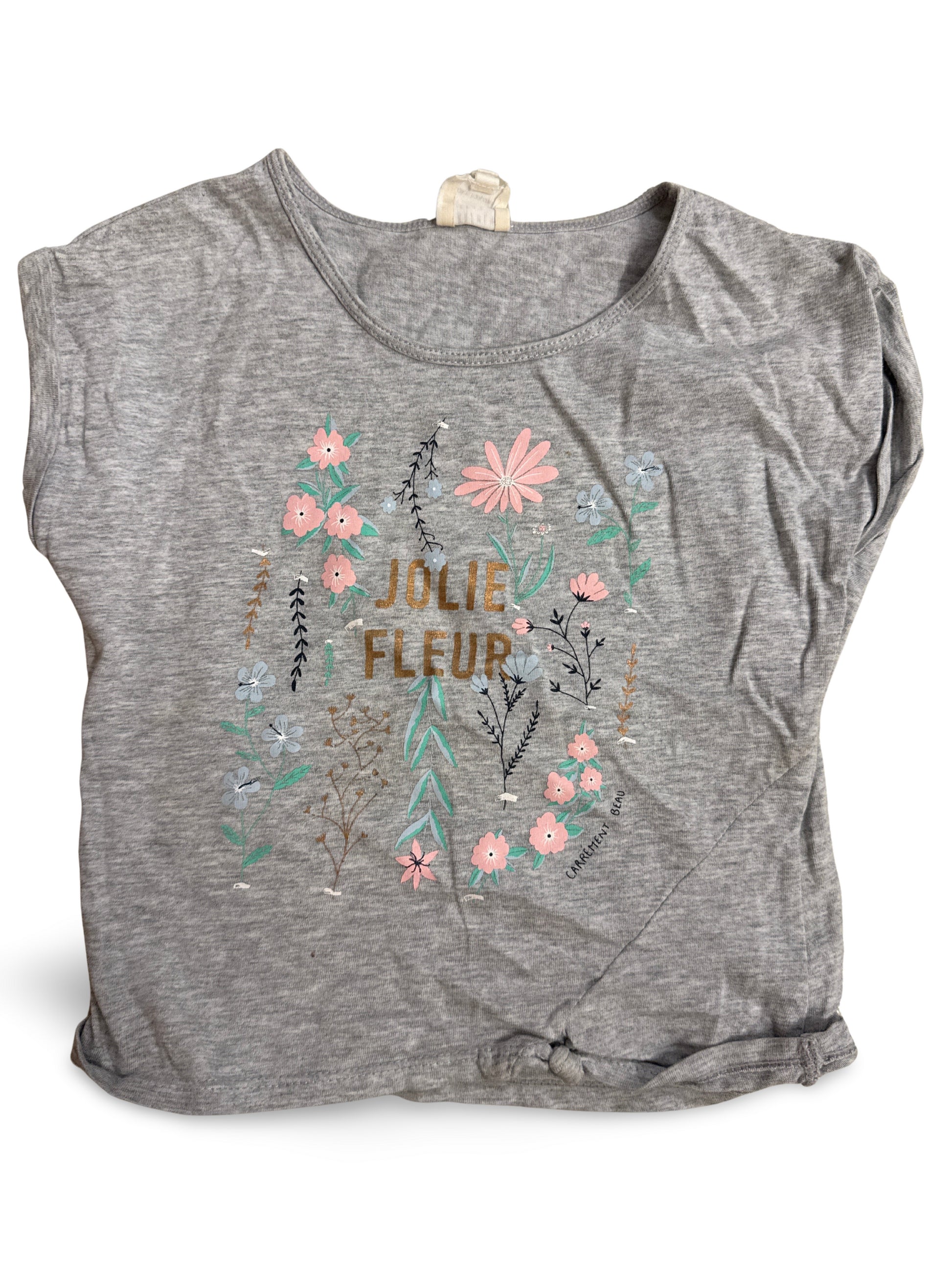 Graues, kurzärmeliges T-Shirt mit rundem Ausschnitt und zartem Blumenprint samt Aufschrift "Jolie Fleur". Der lockere Schnitt und das Knotendetail am Saum sorgen für einen femininen, lässigen Look, ideal für entspannte Alltagskombinationen.
