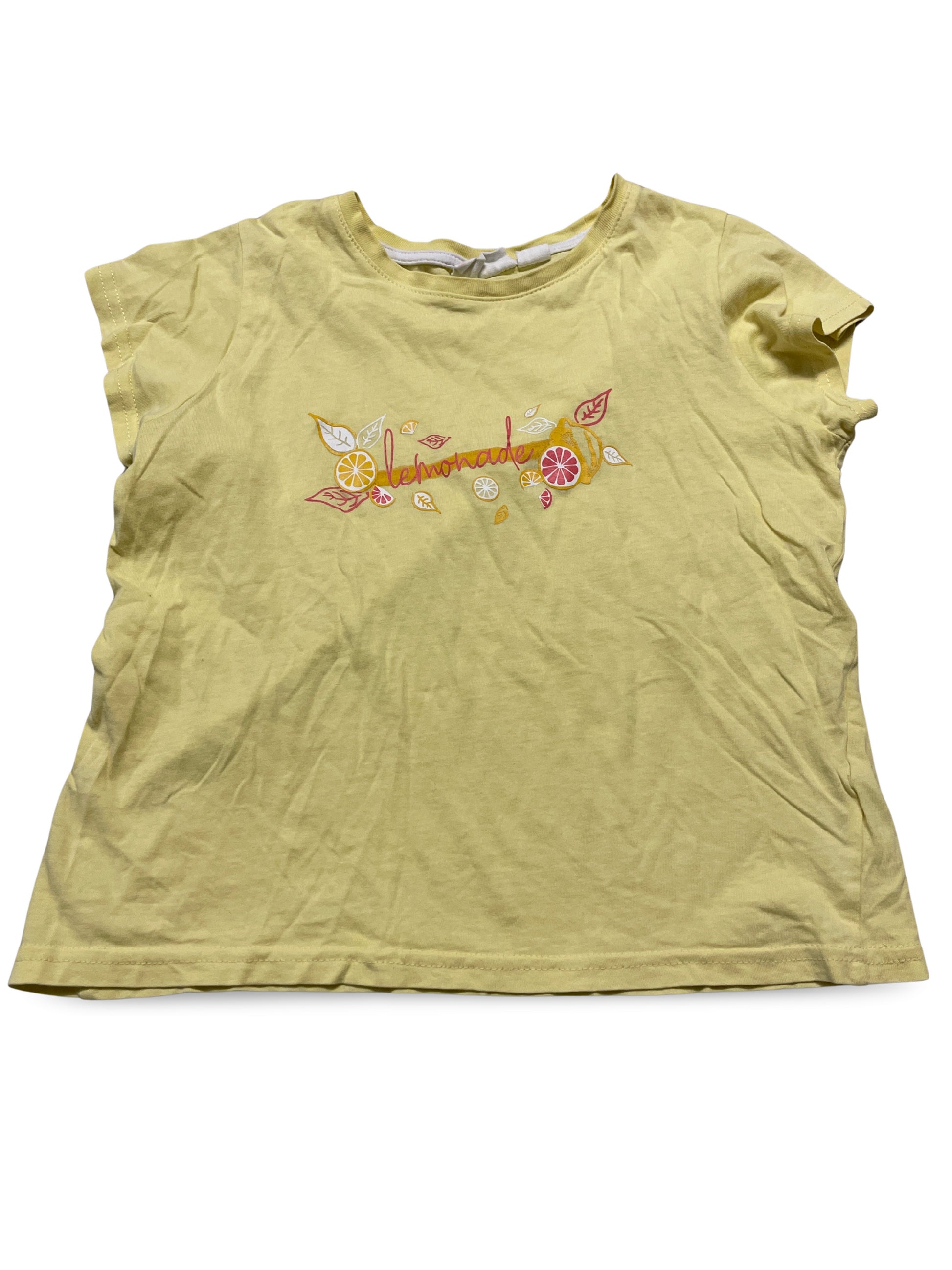 Hellgelbes, kurzärmeliges T‑Shirt mit frischem Zitronen- und Blätter-Print sowie dem Schriftzug "lemonade" auf der Vorderseite. Fröhliches Design, das sich vielseitig zu sommerlichen Outfits kombinieren lässt.