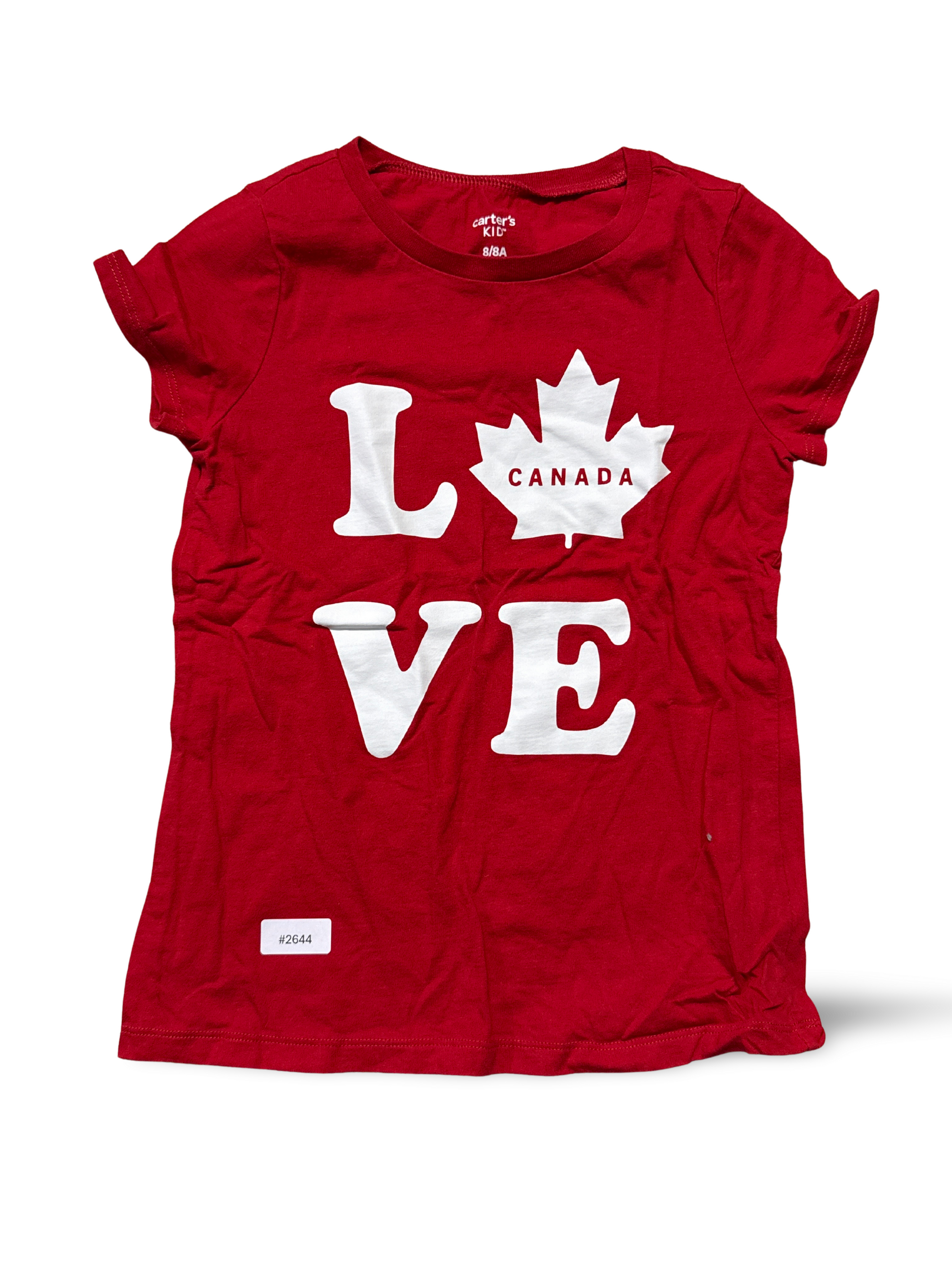 Fröhliches rotes Kinder-T-Shirt mit grossem LOVE-Print und Ahornblatt-Motiv. Bequem geschnitten und ideal für Alltag, Spiel und kleine Abenteuer.