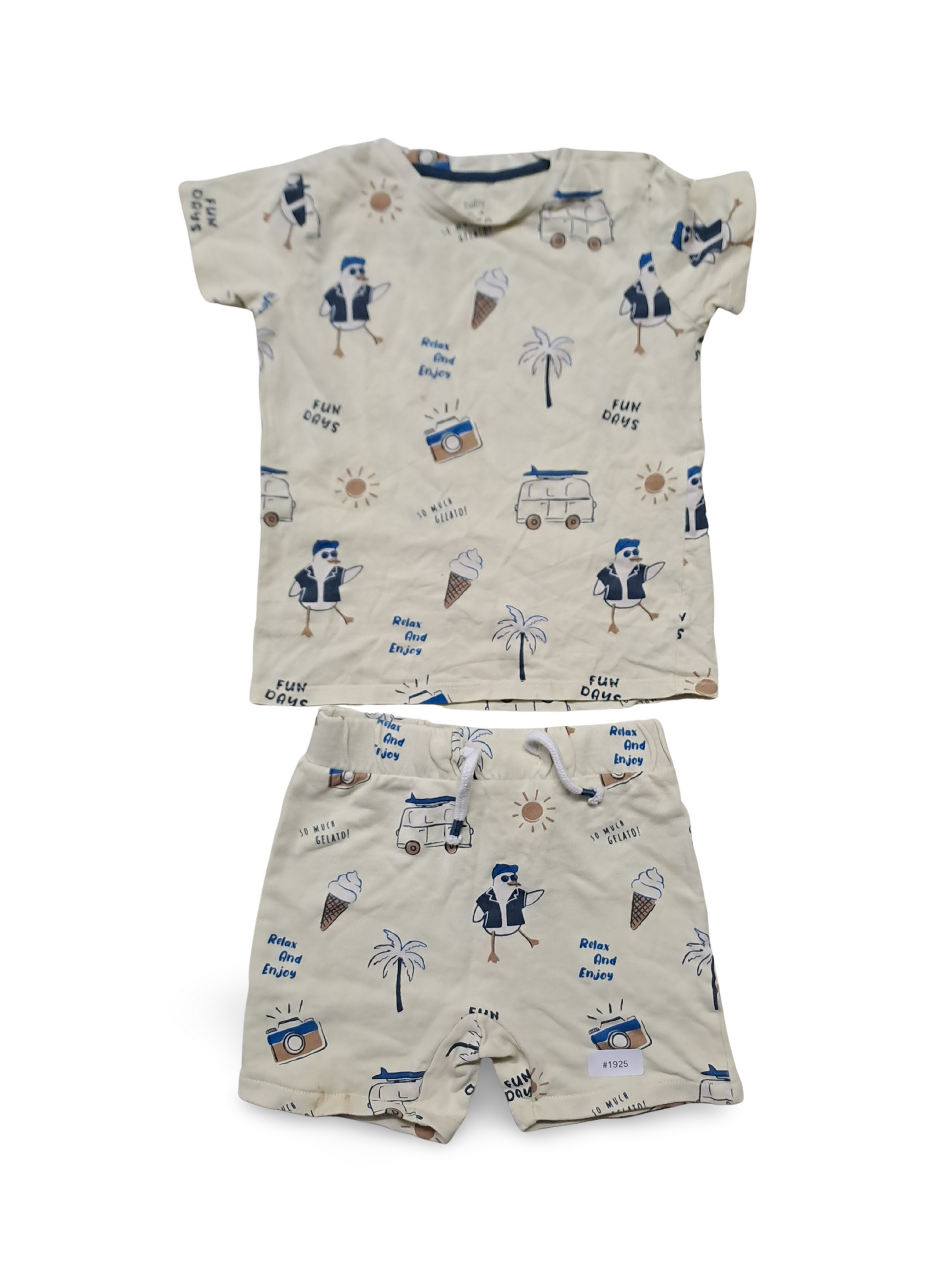 Niedliches Sommer-Set mit verspielten Eis-, Palme- und Kamera-Motiven, das Freude in jeden Sonnentag bringt. Leicht, bequem und perfekt zum Spielen und Entdecken.