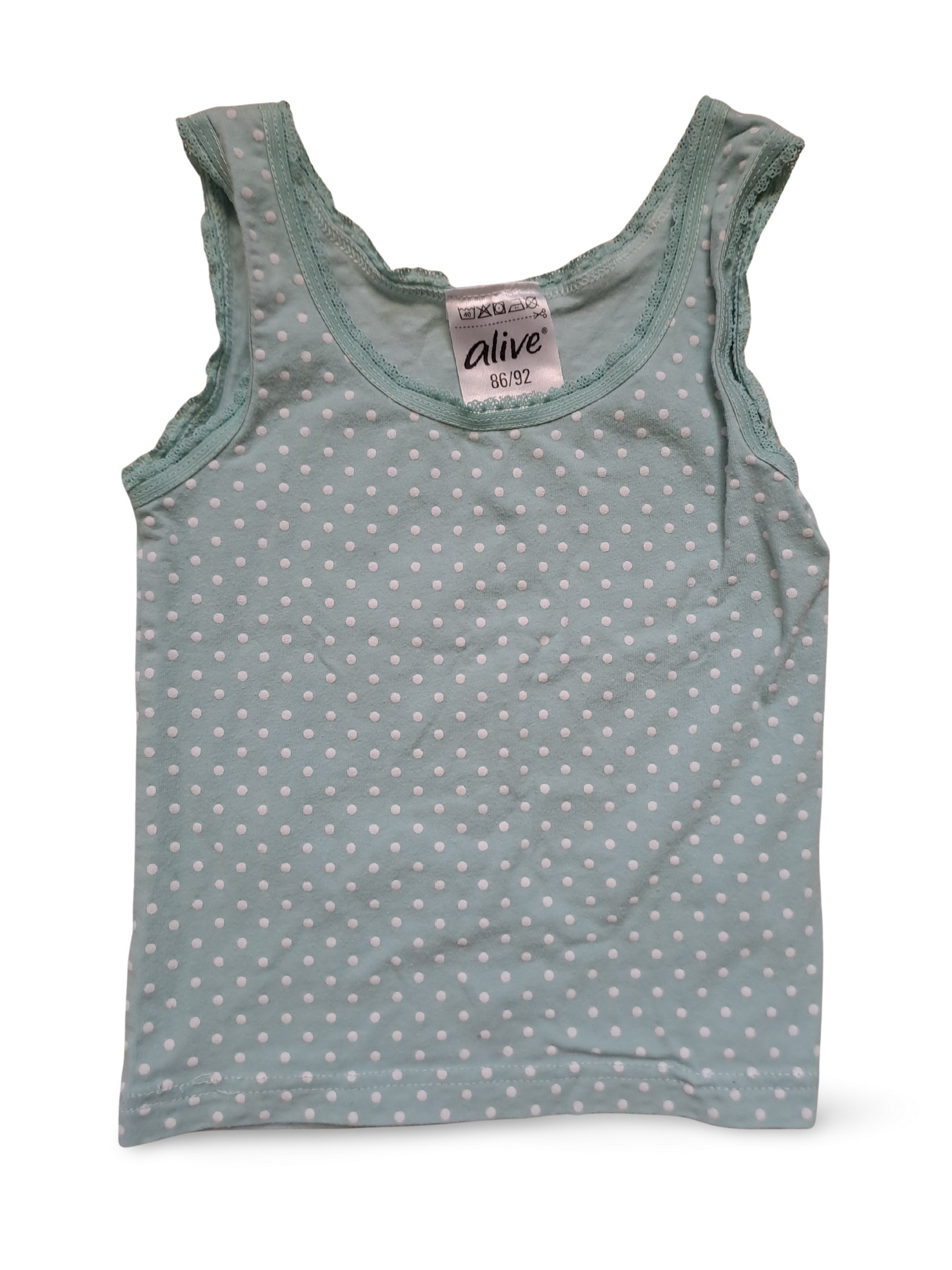 Zartes mintgrünes Top mit weissen Punkten und feinen Spitzendetails an den Trägern. Vielseitiges Basic, das sich gut zu Jeans oder Röcken kombinieren lässt.