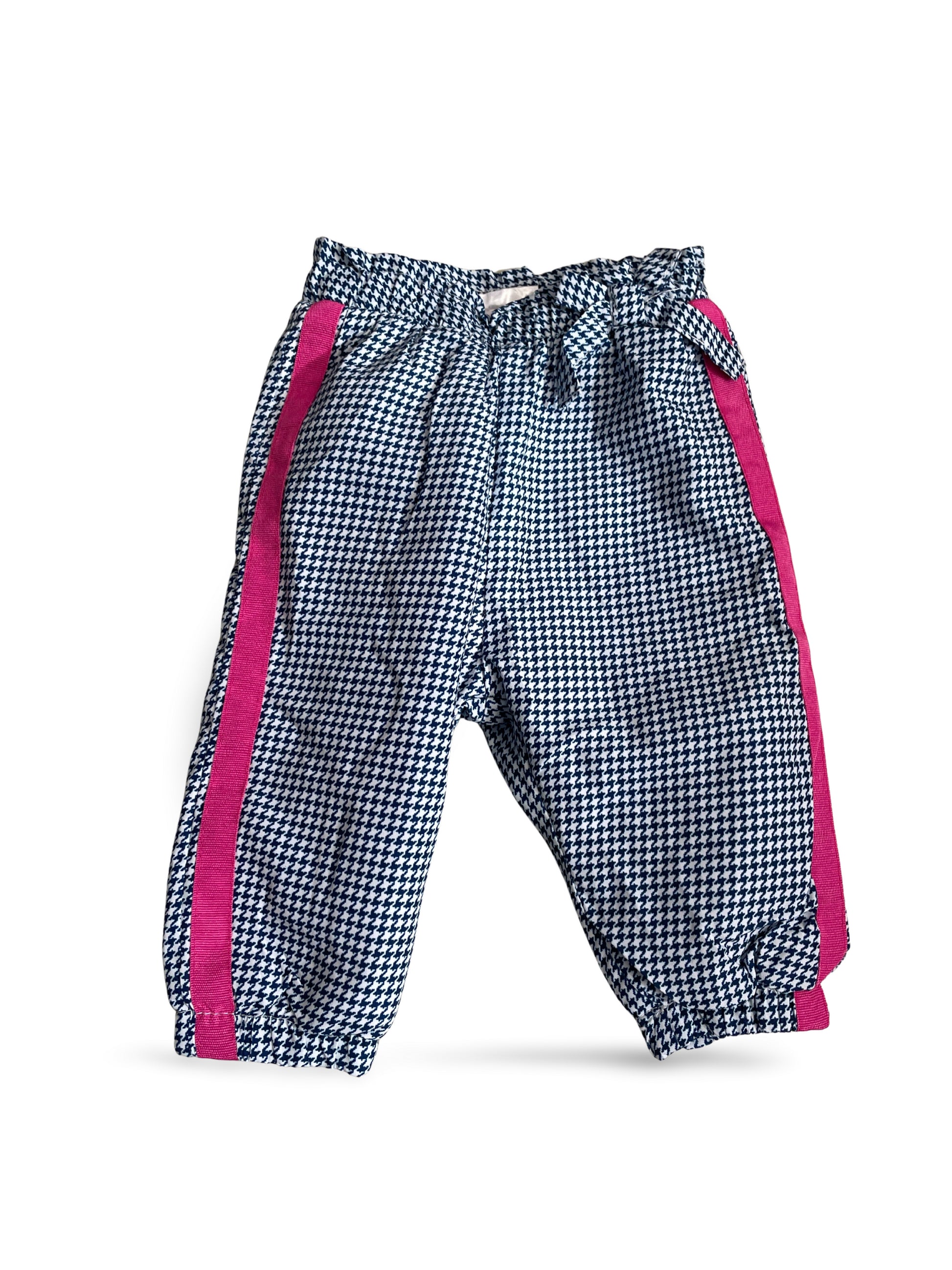 Stylische Kinderhose im Hahnentritt-Muster in Blau und Weiss mit kontrastierenden pinken Seitenstreifen. Der elastische Bund mit Tunnelzug sowie die gesmokten Beinabschlüsse sorgen für bequemen Sitz und einfaches An- und Ausziehen. Vielseitig kombinierbar für den Alltag oder als cooler Freizeitlook.