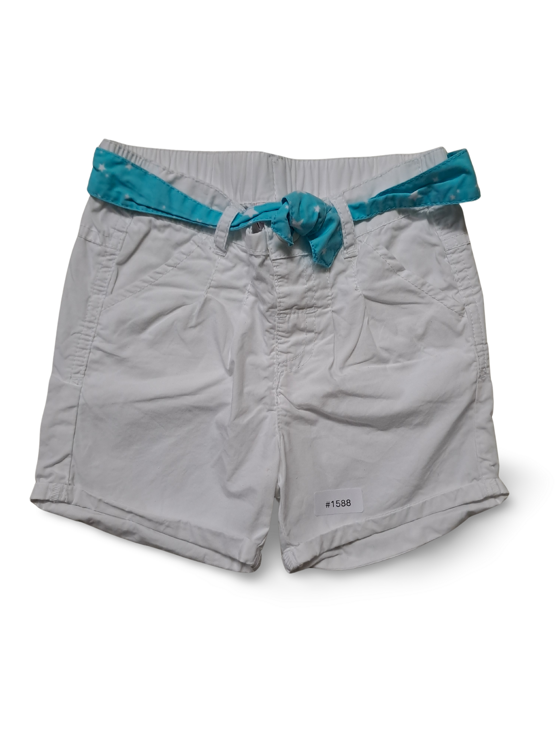 Weisse kurze Kinder-Shorts mit türkisem Gürtel mit Sternmuster, elastischem Bund, seitlichen Eingrifftaschen und umgeschlagenem Saum