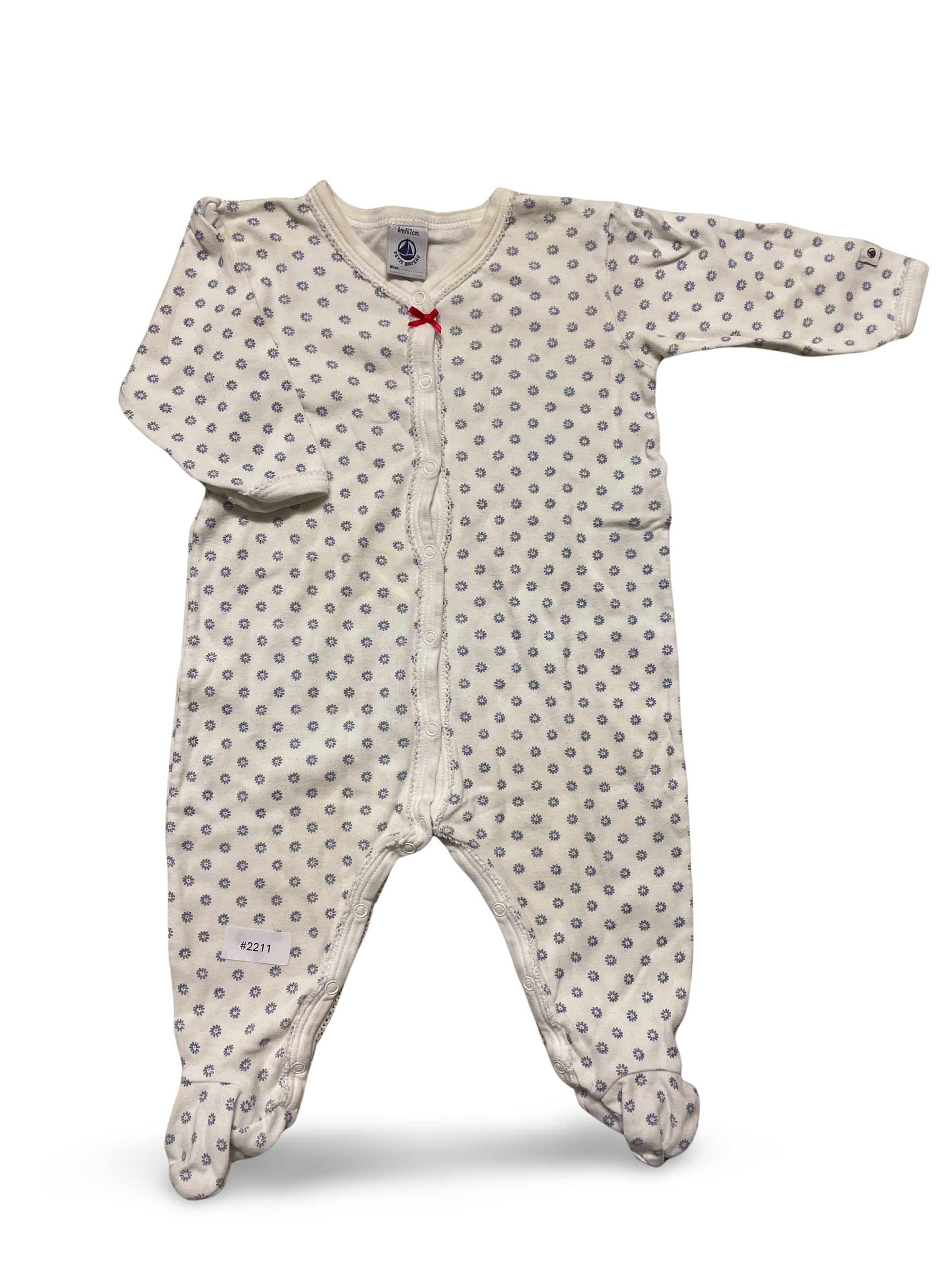 Süsser, zarter Strampler mit kleinem blauen Blumenmuster und einer roten Schleife am Ausschnitt, ideal für kuschelige Stunden und sanfte Träume.