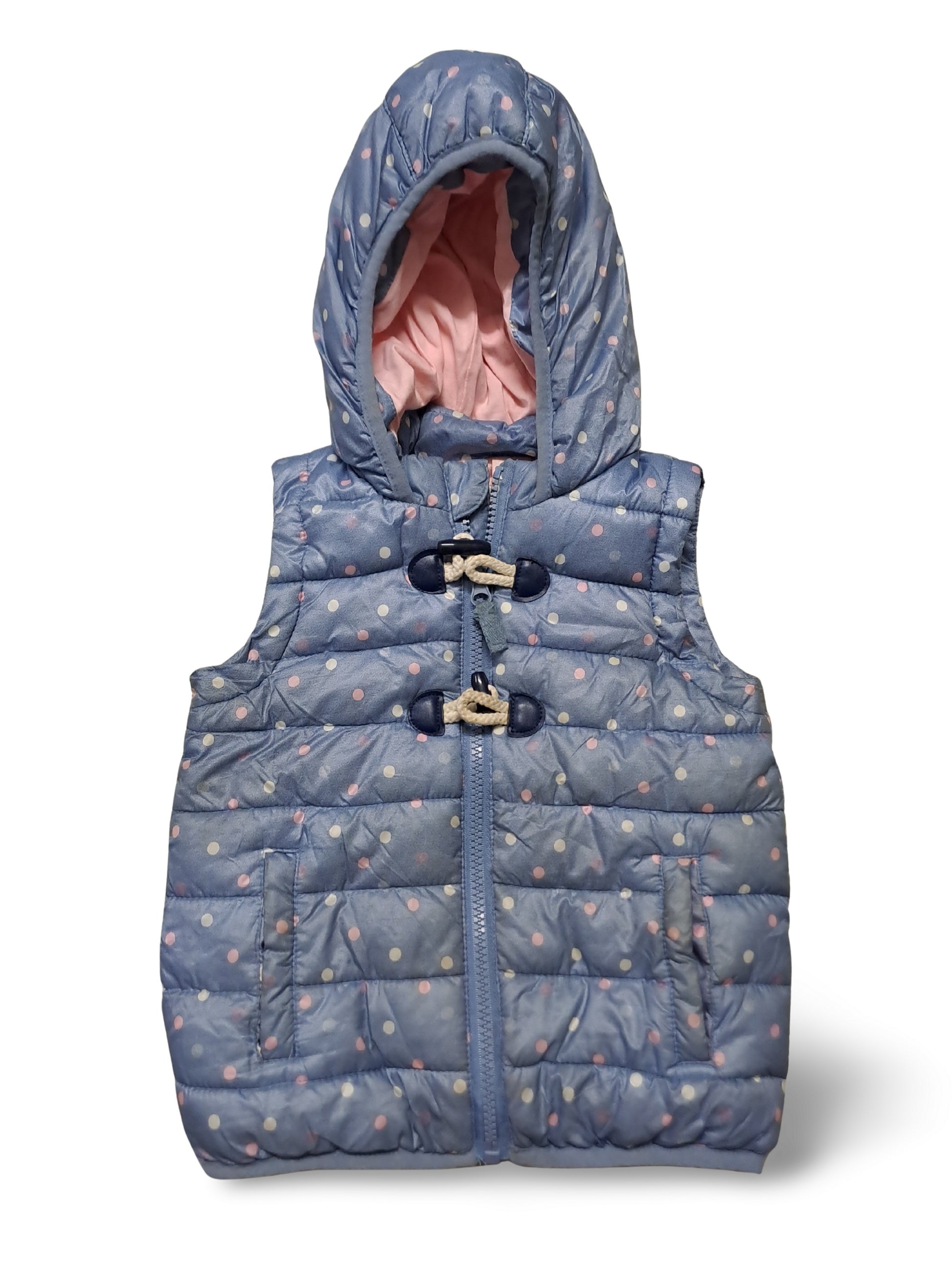 Leichte, wattierte Kinderweste in hellblau mit rosa und weissen Punkten. Mit Kapuze, Reissverschluss, praktischen Eingrifftaschen und dekorativen Knebelverschlüssen. Innenfutter in Rosa sorgt für einen verspielten Look.