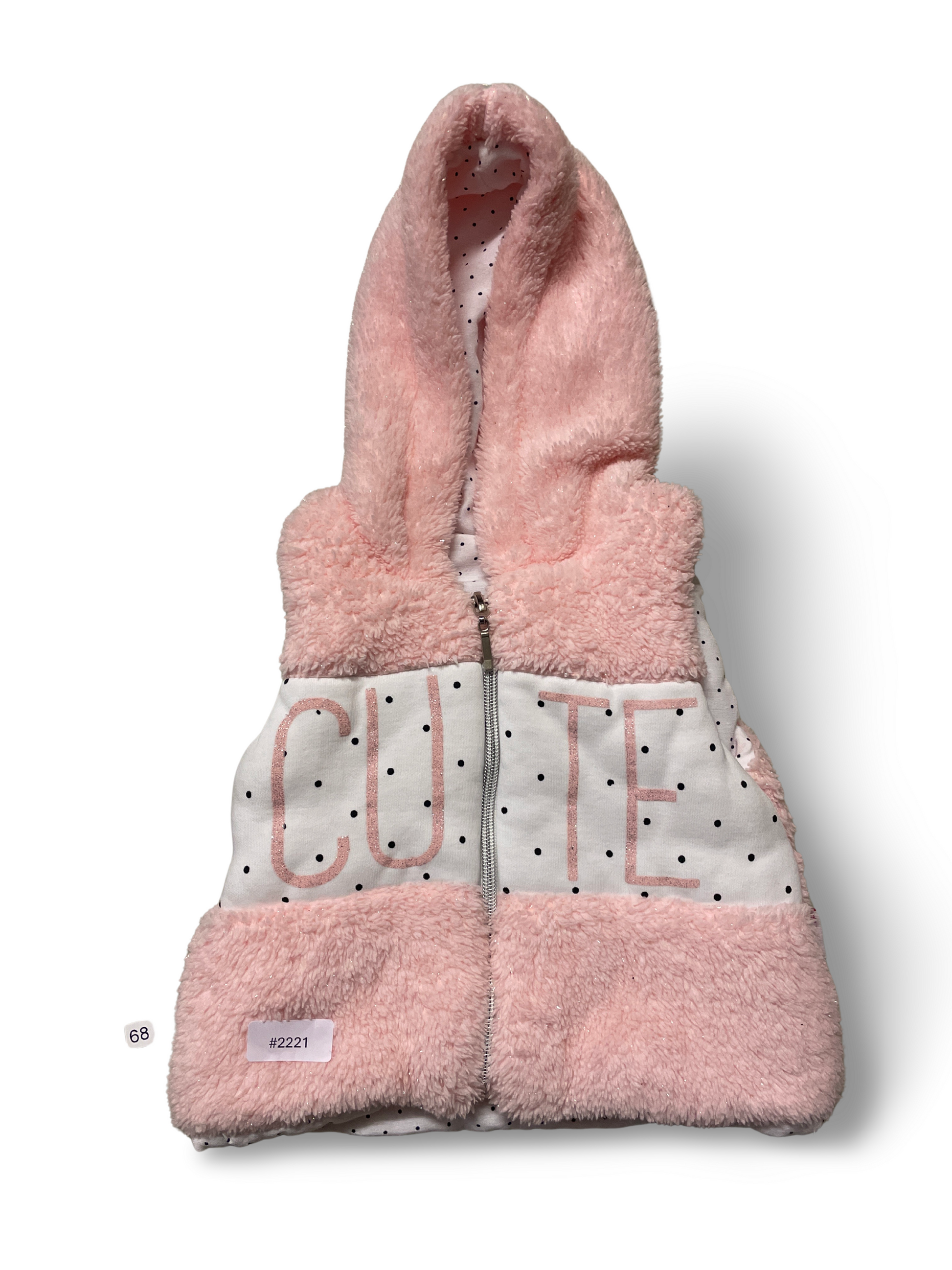 Zarte, kuschelige Kapuzenweste in Pastellrosa mit verspieltem Punktenmuster und grossem CUTE-Schriftzug. Die weichfellartige Aussenlage und das sanfte Innenfutter bieten angenehmen Komfort für kühle Tage beim Spielen und Kuscheln.