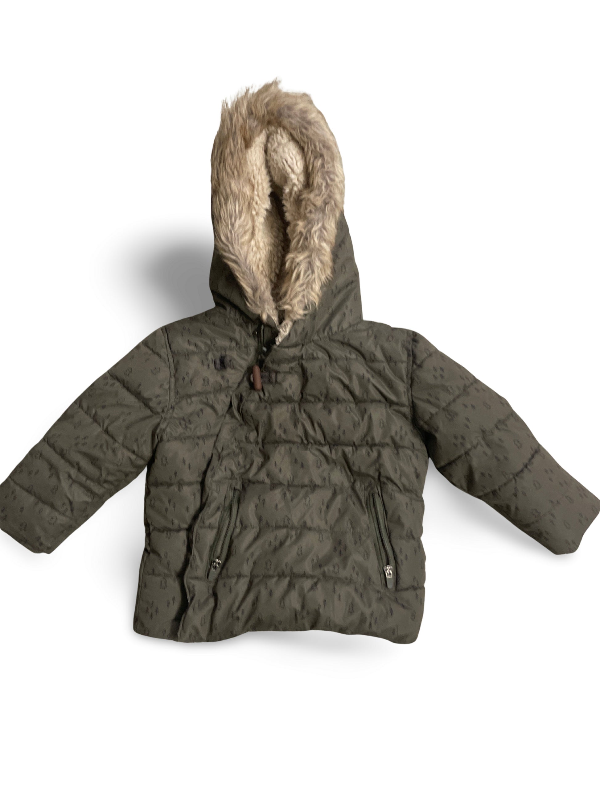 Gesteppte Winterjacke in Khaki mit kuscheligem Kunstfellbesatz an der Kapuze und praktischem Tunnelzug am Kragen. Zwei frontale Reissverschlusstaschen und ein warmes Futter machen sie zum idealen Begleiter an kalten Tagen.