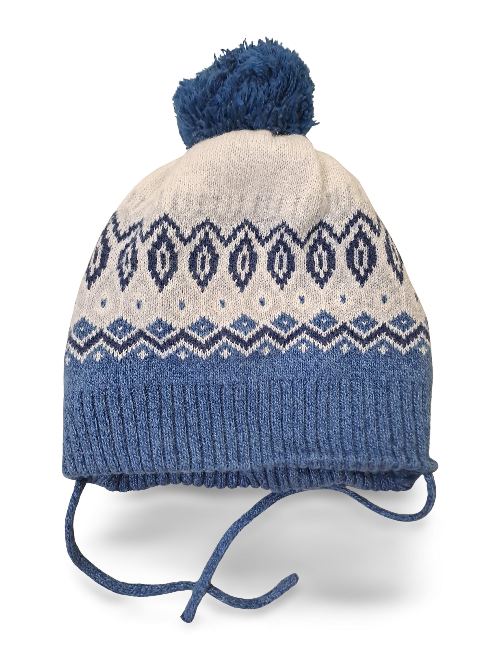 Gemusterte Strickmütze mit Bommel in Blau und Creme im klassischen Norweger-Muster. Mit Bindebändern zum Befestigen und elastischem Bündchen für guten Sitz.