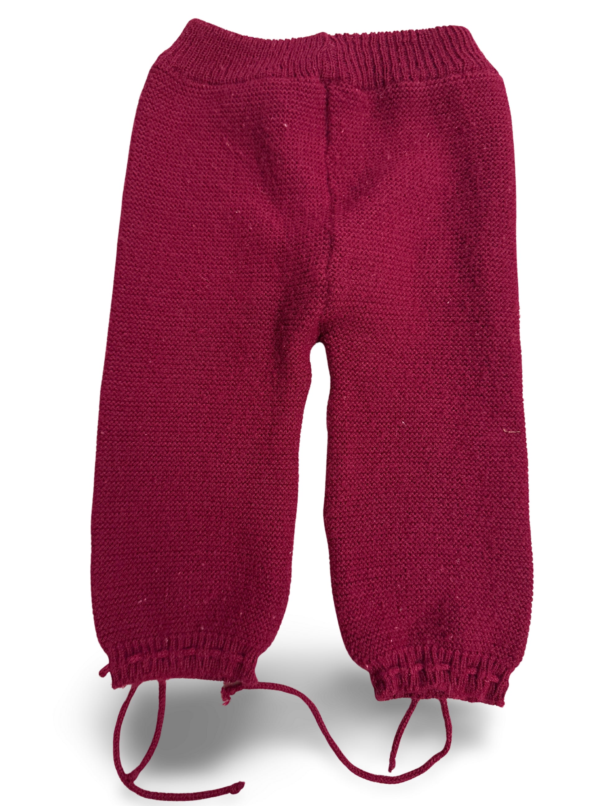 Schlicht gestrickte Babyhose in bordeauxrot mit elastischem Bund. Die Hose hat eng anliegende Bündchen und Bindebändchen an den Beinabschlüssen, damit sie gut sitzen. Zeitloses Design, ideal für den Alltag.
